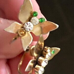 I discovered the matching screw-on earrings later - I think I set them aside because they aren't signed (many designers did not sign all their pieces, particularly if there was a set, and Coro in paticular sometimes had their signature only on the attached tag). They have a "wing span" of about 2/3 inch. The colours are switched from the earrings - eyes are green stones, while the body is clear/white. There is a green stone missing from one and a clear stone missing from the other. Alas, I don't have suitable replacement stones at the moment, but I am sure you can find some. Otherwise the earrings are in great shape! (ga)