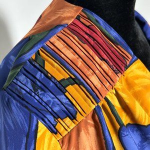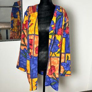 D'Allaird vintage long sleeves vest, made in Canada, probably 100%polyester, no buttton, open long sleeve top, with a ruffle effect on shoulders, pattern is checkers and floral, colors are red, blue, brown and sandy color, size is most likely a Large