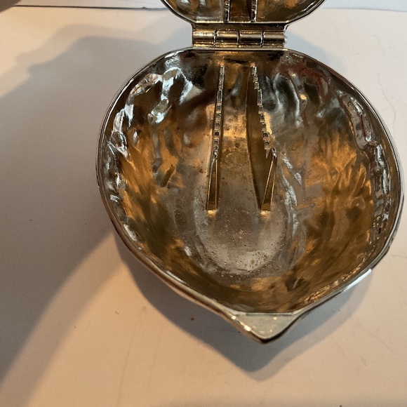 Vintage walnut shaped nutcracker is either silver plate or. Coated aluminum, , I am unsure. It really is a nice decorative piece and everyone has gone for it while sitting on the counter. It also cracks all sorts of nuts and unlike other nutcrackers, it has a double set of teeth. Please check pictures over, it is used slightly and shows some wear on bottom of open shell. I think it would be a great gift for people who love cracking their nuts but lack the strength in their hands to push the nut cracker togeather. It is also a great conversation piece.