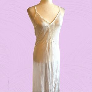 80s vintage white maxi slip dress. A stunner for getting ready on your wedding day! Beautiful semi sheer white nylon with monochrome stripe and beautiful tulip lace cut out detail on chest. No size but best fits a small. A little pilling on the seat, shown in photo, otherwise great condition.
