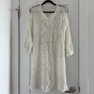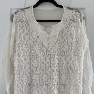 Vintage white silk tunic coverup with hand embroidery - Small