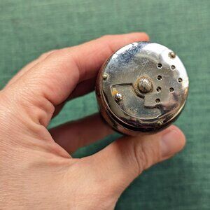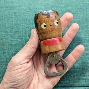 A lovely little bottle opener, made of wood and metal, the top of her head inset with a sliding lid. With marks of age and use, including rust to the metal.