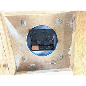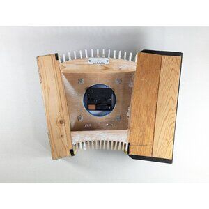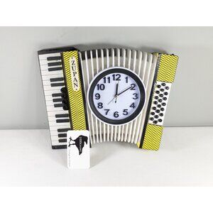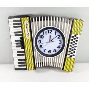 A very fun hand made accordion wall clock, the body made from wood and with added plastic clock parts. The name ZUPAN has been added to the top left. There is even a leather hand strap along the right hand side. The clock runs on batteries and looks to be working well.