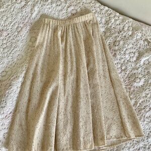 Vintage wool a-line cream skirt. No size but would fit a small best, elastic waist. White and brown speckled pattern, slightly sheer, has union made tag. In great condition, perfect for late summer or fall