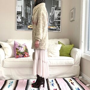 Fuzzy texture. Light wear of yarn. Fully lined. Knit shell. Hand pockets. Snap button front closure. Labelled XS. May fit up to size Small(See measurements). Made by Alafoss of Iceland. Shell: wool. Lining:65%cotton/35%polyester. Approx 31in length, 23in shoulder seam to seam, 16in sleeve length, 21.5in pit to pit, straight cut. see some staining on collar(last pic)