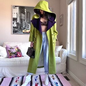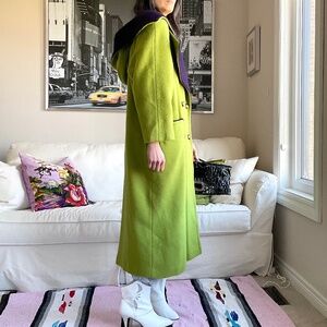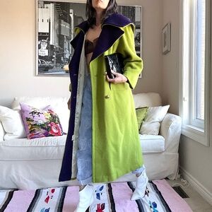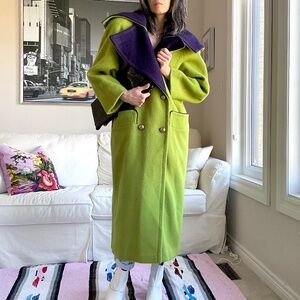 Purple/green. Gold toned domed buttons. Large open collar at front that blends to a hood. Shoulder pads. Fully lined. Hand pockets with purple detail. Made by Novelti. Labelled size 9/10(see measurements). Model is size small, 5’9. Shell;55%wool/45%mohair. Lining:100%acetate. Approx 49in length, 27.5in item collar to cuff, 23in pit to pit, 22.5in width at hip area and straight cut down. Minor scratches on buttons(see pic). Balding spot on wool(see pic)