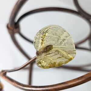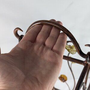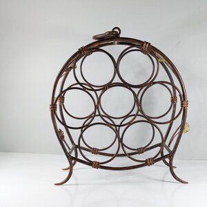 A delightful metal wine bottle rack, the colour to mimic wood or bamboo. It has "wine rack" twists on the side with small glass leaves in yellow and orange.