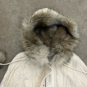 Vintage y2k Cream Cable Knit fishermen Hooded wool blend Cardigan with Fur Trim