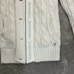 Stylish cream cable knit cardigan with a fur-trimmed hood. Features button closure and cozy design.