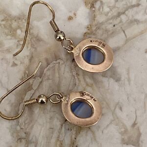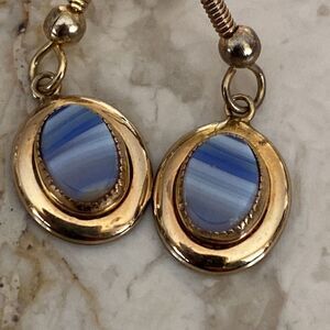 Lovely pair of vintage 12K gold filled drop earrings. Beautiful simple and elegant setting surrounding a gorgeous oval blue agate stone.