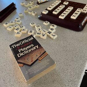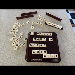 Vintage 1983 Milton Bradley Upwords 3-dimensional word game. Spell out, stack up and score high! Comes with a free Scrabble dictionary. Game is in very good condition but missing 4 of the letter pieces.