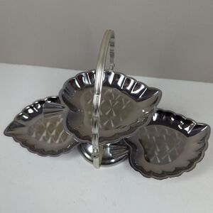 Charming vintage 3-tiered metal serving dish featuring leaf-shaped trays and a unique foldable design. Made in Hong Kong, this piece is both functional and decorative — perfect for entertaining, serving snacks, or as a retro centerpiece.