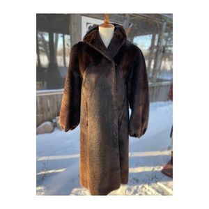 Longline sheared beaver fur coat with turnup style collar, huge balloon sleeves with elastic cuffs and hook/loop front closure. Fully lined in a fuchsia geometric satin fabric. Has a left side lining pocket with an origami style trim. Two outer hip pockets. Inner waist ties to secure the garment. Triple letter embroidery patches on right side lining from original owner. No stains, holes, tears or fur loss noted. No shedding noted. Stored in pet and smoke-free, cold storage.