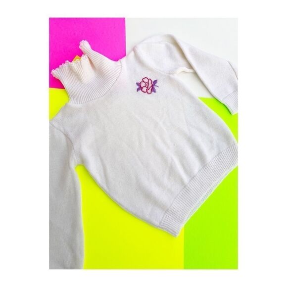 Size 3X on tag. 100% acrylic. Tricots knitwear. White or light cream with ruffle turtleneck, slightly puff shoulder, long sleeves and Rose embroidered design to the chest. No rips, tears or stains.