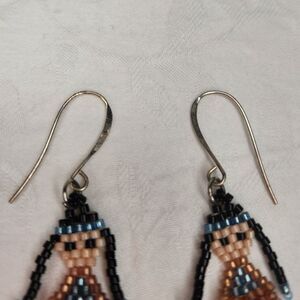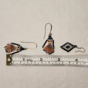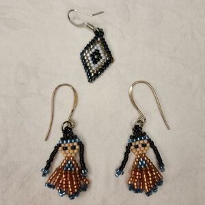 Vintage 1970s, complimentary singular unmatched 1980s peacock blue & silver diamond shaped bead earring included, sterling silver unstamped hooks, EVC.