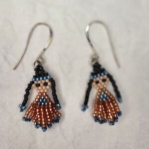 Matching little girl with traditional Indigenous copper & blue tassle fringe dress micro seed bead earrings handmade with braids eyes & headband.