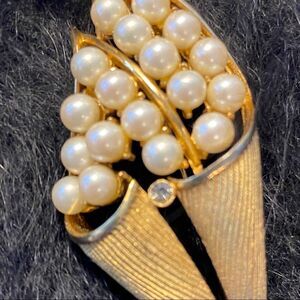 This is a quality brooch. There’s a little weight to it. It’s a pretty floral motif, with the faux pearls representing the flowers. Traditional but beautiful.