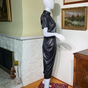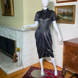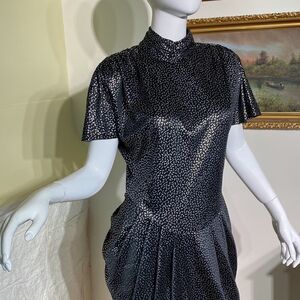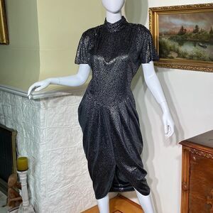 You’ll definitely be making a grand entrance in this authentic vintage piece! Check out that harem skirt and ruched high neck and bell sleeves! Features silver glitter dots on jet black fabric.