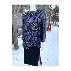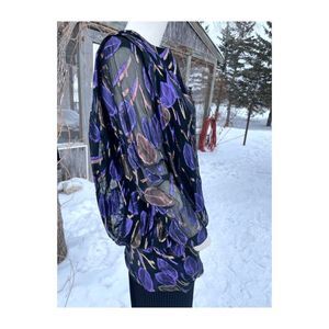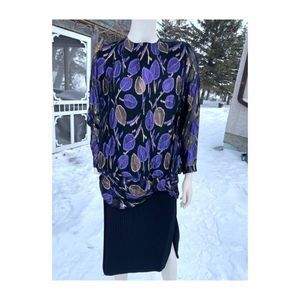 No brand, size or fabric tag. Sheer outer metallic print layer, fully lined to the bodice with an inner solid black layer, sleeves remain sheer. Open back with neck tie closure. Shoulders are padded. Drop waist hem with a gathered loop detail. No stains, holes or tears. Pet and smoke-free studio.