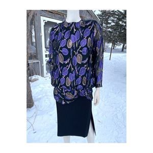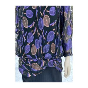 Vintage 80s Blouse Metallic Leaf Print Sheer Open Back Gathered Waist