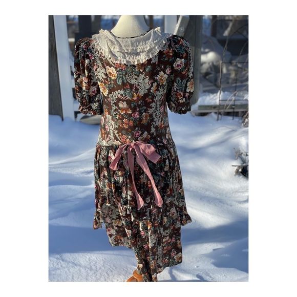 Vintage 80s Boutique Prairie Dress 19th Century Style Puff Sleeve Bustle Lace
