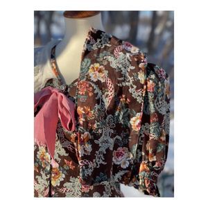 Size S on tag. V neckline with delicate sheer lace collar and pink ribbon bow. Button up front closure to the waist, Metal oblong buttons with a gold metal cameo centre. Only 1 button retains centre cameo. Short huge puff sleeves with ruffle cuff. Slightly drop waisted with a pleated skirt. Rear of dress features 3 tiered layers forming a 19th century styled bustle and topped with a pink ribbon bow. No stains, holes or tears. Only apparent flaw is the buttons that have lost their details. Pet and smoke free home.