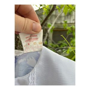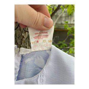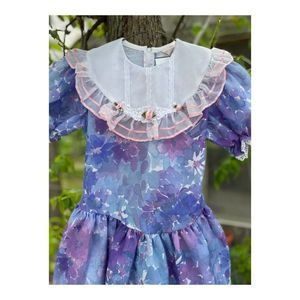 Short puff sleeves with lace trim, white ruffle collar with lace and rosebud details. Rear zip closure. Attached self colored belt. Peplum or tiered skirt with lace trim. Lovely purple & blue floral watercolor print. No stains, holes or tears. Pet and smoke free studio.