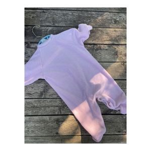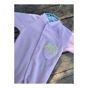Tag unreadable. Approx Sz 3-6 months. Terry cloth footy sleeper with metal snap button closure. Light pink body, pink/white striped cuffs and collar. Teddy bear dozing on balloons on left chest. Brand is Little Me.