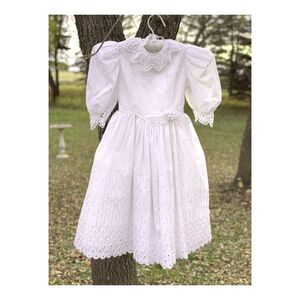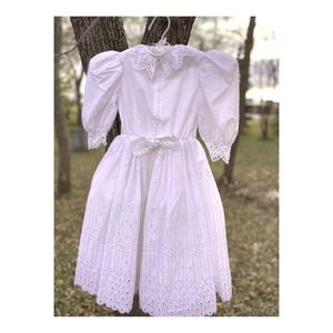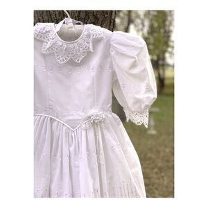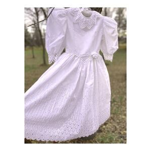 Vintage 80s White Formal Dress Fit & Flare Puff Sleeve Eyelet Lace Sz 5 Communio