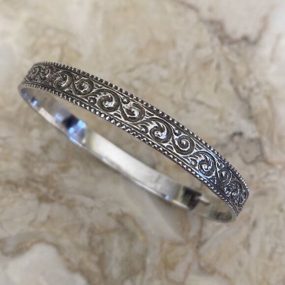 Gorgeous vintage handcrafted sterling silver bangle bracelet in very good preowned condition. Detailed fancy etching makes this piece really stand out. A beautiful addition to your bangle collection, because you can never have enough 😊