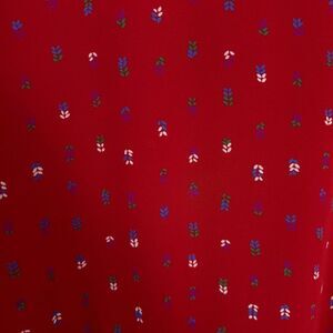 Lovely red vintage dress from Antels with a ditsy leaf stem small pattern. Loose fit sleeves gathered at the cuff with a single button closure. Elastic cinch waist with a surplus flounce fringe. The shoulders have a gather puff with a little padding underneath to help their shape. Roundneck collar with keyhole button and loop closure at nape of neck.