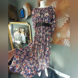 Elegant vintage floral print maxi dresse with a flowy and billowy design. Perfect for any occasion. Long sleeves with wide boat neck, pintuck pleating detail down front. Pullover style. Vintage item from the 1980s, excellent condition, no flaws to note. No material tag but almost certainly polyester chiffon, transparent,will need a slip. No size but would fit large best imo! See flat lay measurements below!