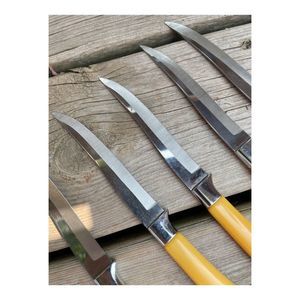 Handles form to blade. Stainless steel blades shiny and show minimal wear or scratches. No box Included.