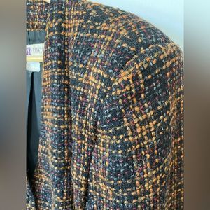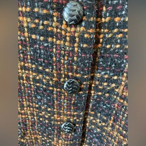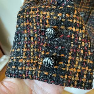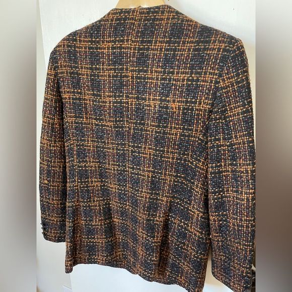 Beautiful colours, lining is in good shape, a little bit of pilling but nothing serious. One sleeve is missing a button as shown, not very noticeable. Shoulder pads are sewn on inside the lining (not removable unless lining removed).