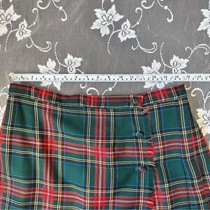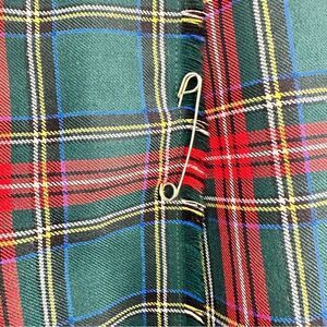 Classic red, green and yellow tartan skirt ( also referred to as Princess Mary) , with frayed edge hem , pleated back and sides, fabric buttons and large safety pin .