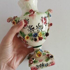 Vintage Capodimonte Style 7" Vase, Pedestal Urn Florals Handpainted Flowers Italy Porcelain Ornate Handled Vase Handmade