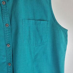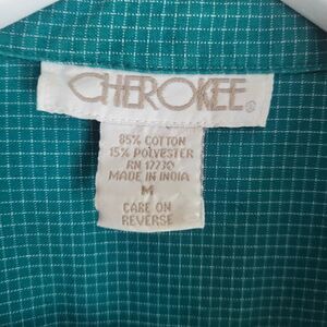 Super cute retro unisex sleeveless button down shirt. Vintage Cherokee. Very well made. Excellent preloved condition no stains or tears. Teal kue colour with a fine white gridlines pattern throughout. Cotton poly blend.
