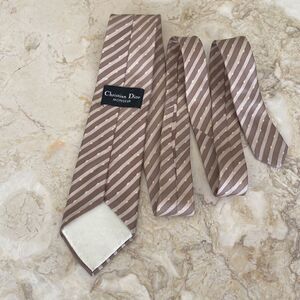 Lovely vintage Christian Dior silk tie, features an elegant pattern and soft tan and yellow tones. 3” width. Please see last photo for tiny wear at the top of the tie. Priced accordingly.