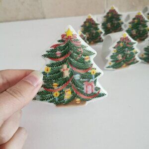 This is a gorgeous set of 8 napkin rings and 2 candle holders made in Japan and imported (to North America/Canada) by Abbott. These pieces of Christmas table decor are lovely with no damage except some lingering candle wax in the holders. The front of each piece is shaped as a Christmas Tree and has beautiful illustrations of a fully decorated tree with ribbons, and ornaments.