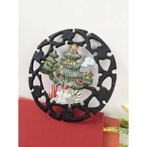 Unique iron trivet for the holidays. Hand painted christmas scene with trees, snowman and candy cane. There are 3 feet to keep your pot away from the table.