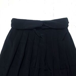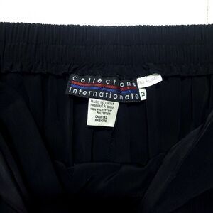 Matte silk-feel black polyester vintage midi skirt from Collections Internationale. There is a twist knot detail at the waistband which can be switched to either front or back of the skirt. The front of the waistband otherwise is just flat at the front and elastic gather along the back. 2 hidden sideseam pockets.
