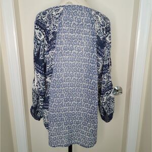 Vintage 90s, highlow hemline, 3/4 sleeve, scoop neck, Pearlecent Abalone Shell Buttons, Great Vintage Condition, I repaired one lace flower at the bottom of one sleeve (last photo), no upper tag, Size L, Pit-22, Length-23-30.