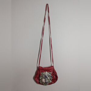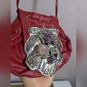 This is a rare and eye-catching vintage Copa Creation handbag crafted from soft red leather and adorned with a stunning sculptural silver-tone plaque featuring natural amethyst and rose quartz stones. These collectible pieces are known for their organic, almost Art Nouveau–inspired design, and are sought after by collectors of both Copa Creation and Carvalhu handbags, as the designs overlap closely.