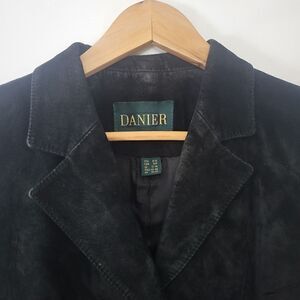 Fabulous condition vintage black suede leather button down jacket by Danier. Made in Canada. No stains or tears or fade etc. Fully lined. Size US 8-10.
