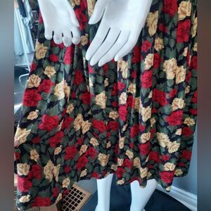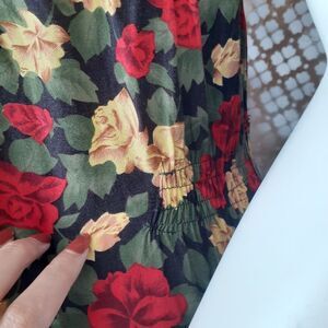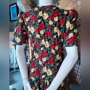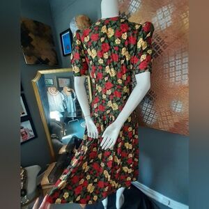 This elegant vintage floral button-down dress features a vibrant mix of red, yellow, and green and black hues. Perfect for any occasion, it offers a stylish and comfortable fit. No material tag but I believe it to be rayon. Drop waist with elastic gorring at waist. Short sleeves with shoulder pad detail. Ornate gold and black tonal buttons down front.