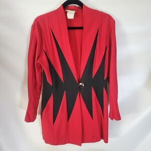 Snazzy design red and black vintage blazer jacket by Emblem. Excellent preloved condition, no stains or tears. Single button and loop front closure.