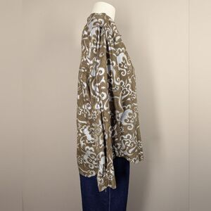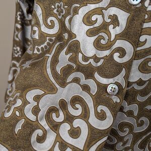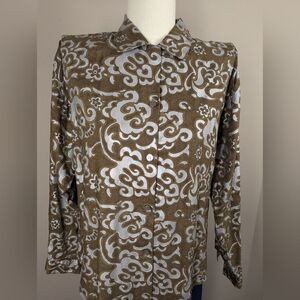 Vintage Esprit blouse featuring a unique metallic-look fabric with an abstract floral swirl pattern in brown and silver. Lightweight with a subtle sheen, button-front closure, and collared neckline. A perfect statement piece that can be styled for retro office looks, Y2K vibes, or tucked into jeans for casual chic.