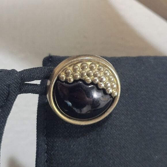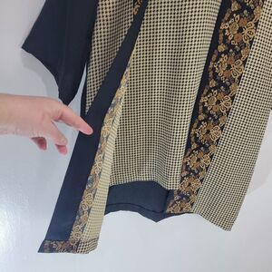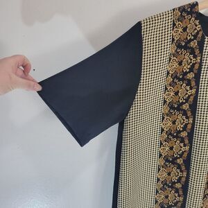 Unique vintage short sleeve blouse constructed from differing lengths of floating panels. There's the back panel which is just solid black, then there's a front central panel of black and tan houndstooth pattern, framed either side by 2 overlapping panels of the same pattern but bordered on their inner edges with bands of retro brown florals. Such a cool design with an old classic charm. Lovely little keyhole button closure at back of neck. No shoulder pads.