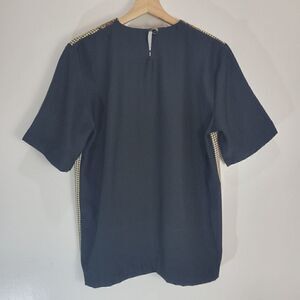Unique vintage short sleeve blouse constructed from differing lengths of floating panels. There's the back panel which is just solid black, then there's a front central panel of black and tan houndstooth pattern, framed either side by 2 overlapping panels of the same pattern but bordered on their inner edges with bands of retro brown florals. Such a cool design with an old classic charm. Lovely little keyhole button closure at back of neck. No shoulder pads.