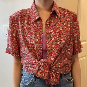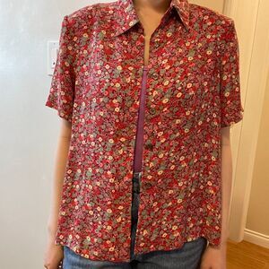This vintage floral button-up blouse is a charming and timeless piece. Featuring a structured collar and light shoulder pads, it provides a flattering shape while maintaining a soft, flowy fit. The delicate floral print in red, pink, and green hues adds a classic vintage touch. Perfect for layering or wearing on its own, this blouse is a must-have for any vintage lover.